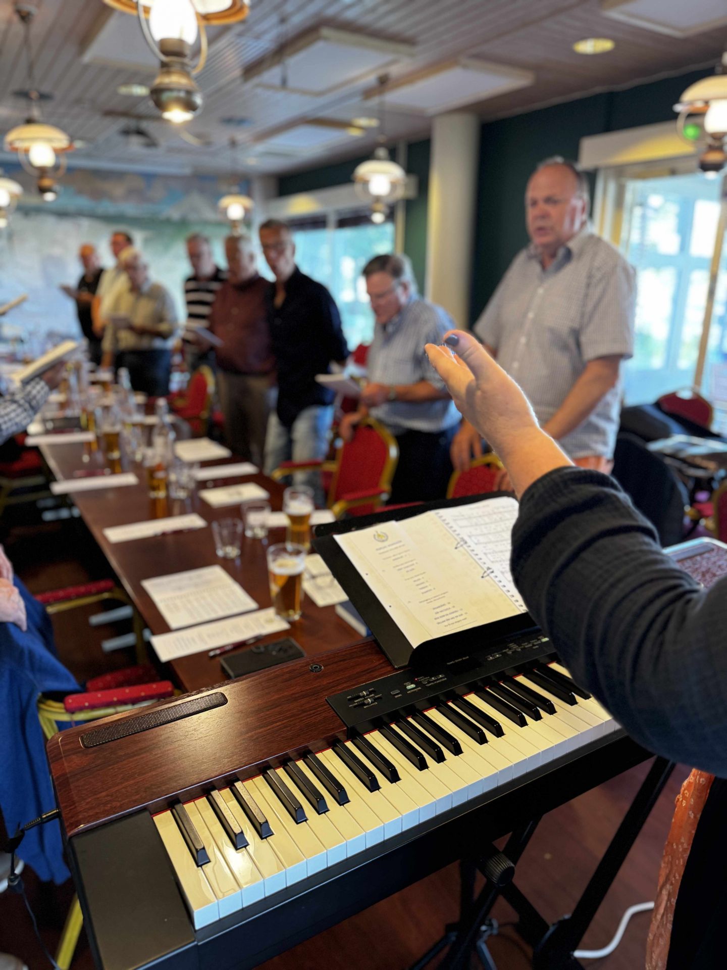 Men vad sjutton håller manskören på med på bilden? Jo dom fonerar dvs bubblar genom ett specialglasrör nedsänkt i vatten. Den finska metoden framtagen på 1960-talet har visat sig bla förbättra det för sångaren så jätteviktiga "stödet". Kolla ordet RÖRFONATION på nätet så får du veta mera!